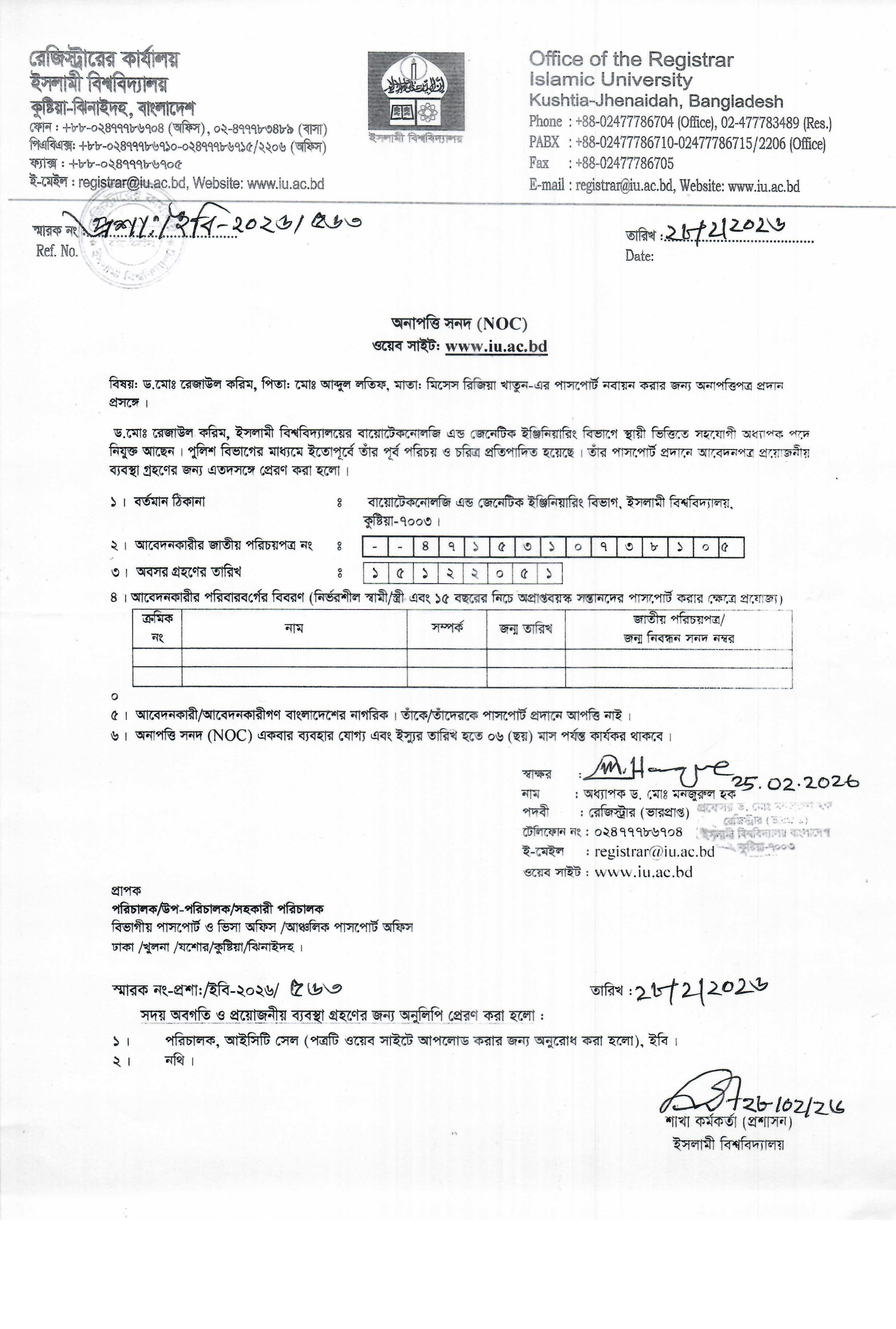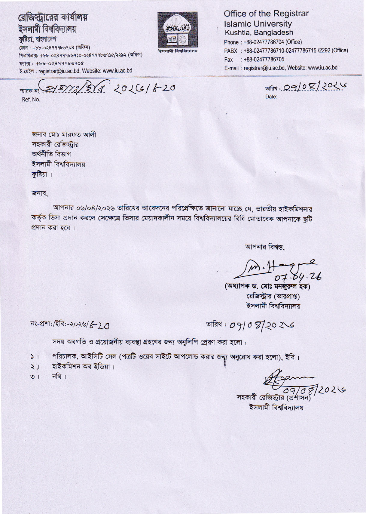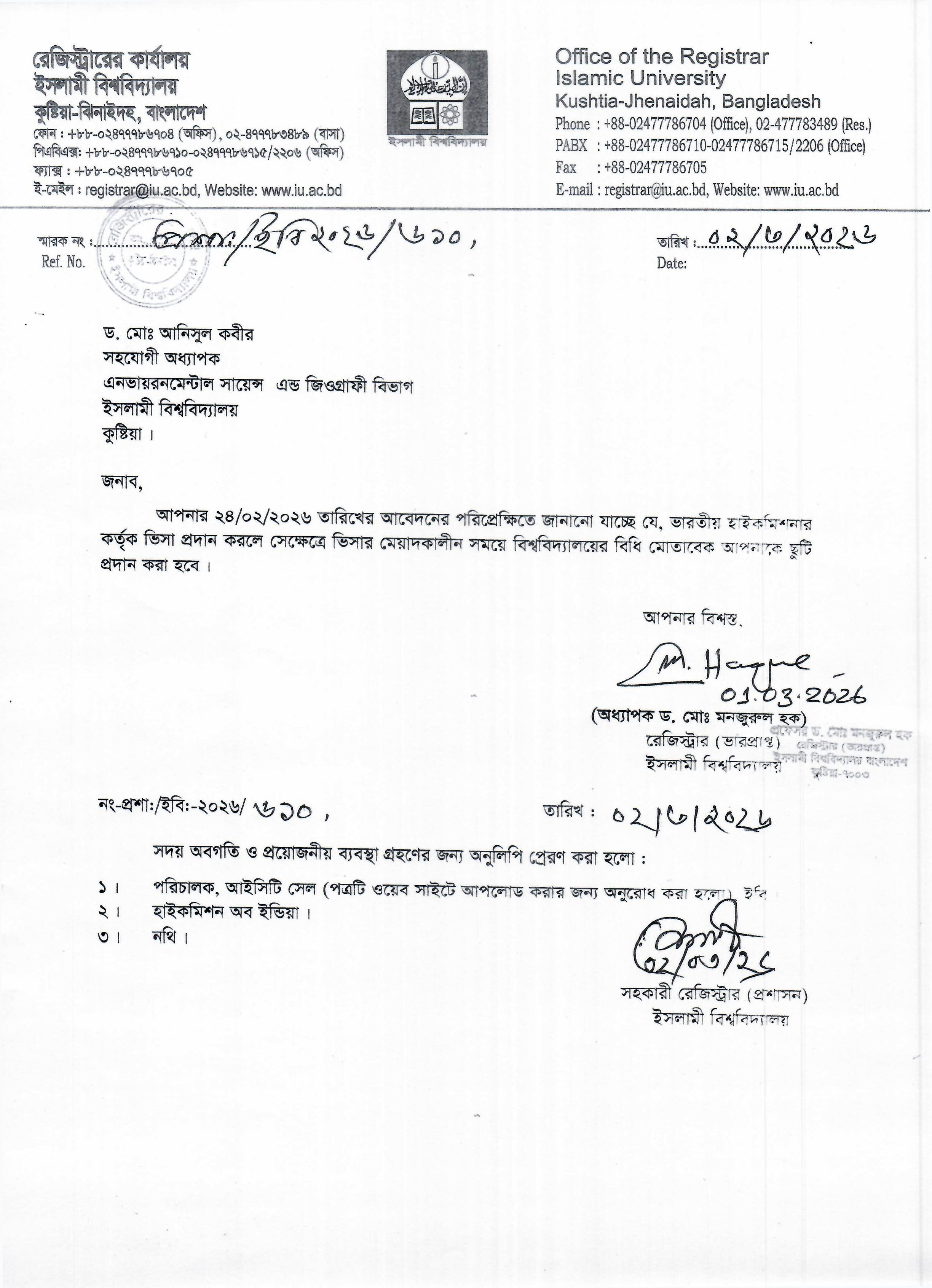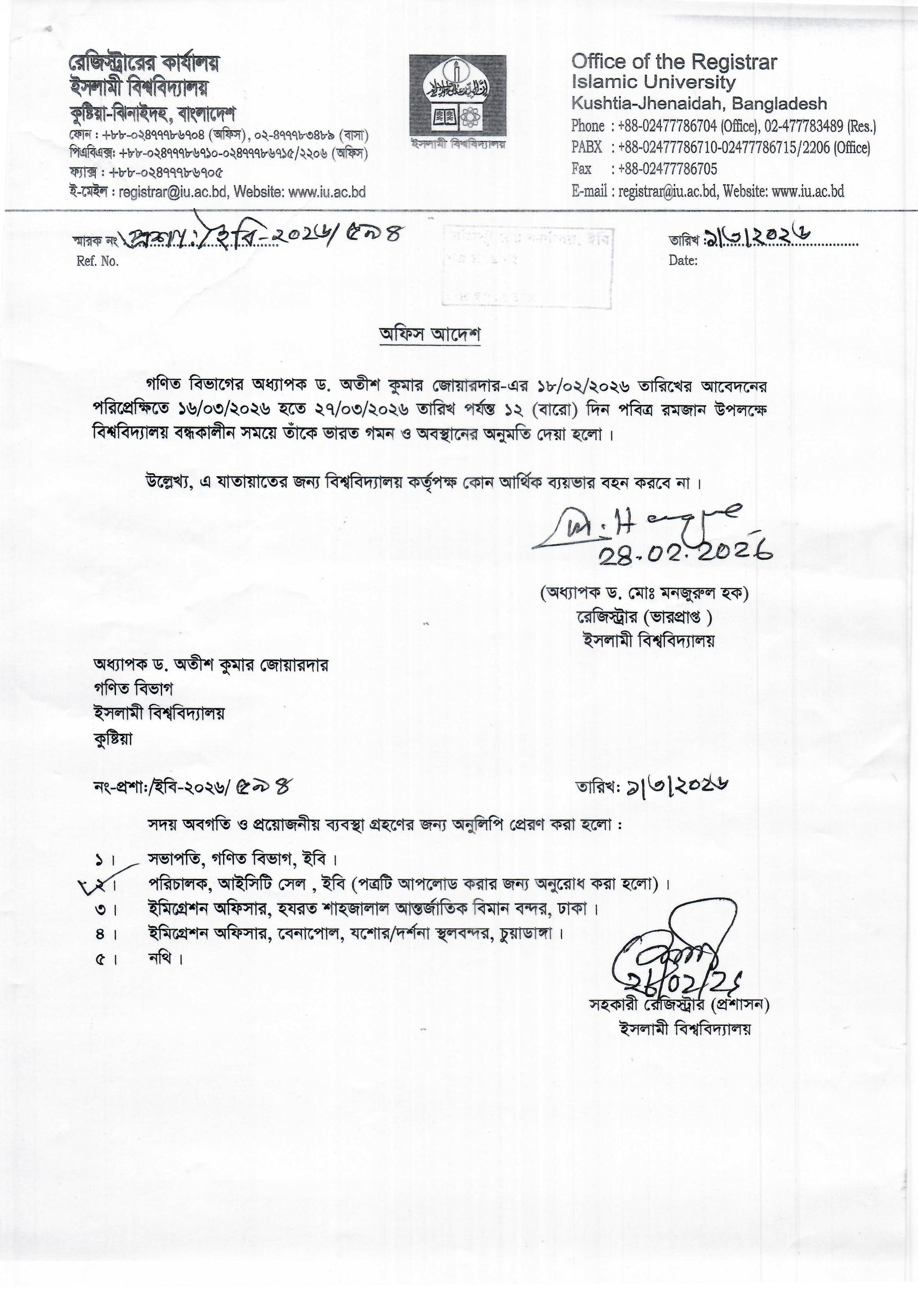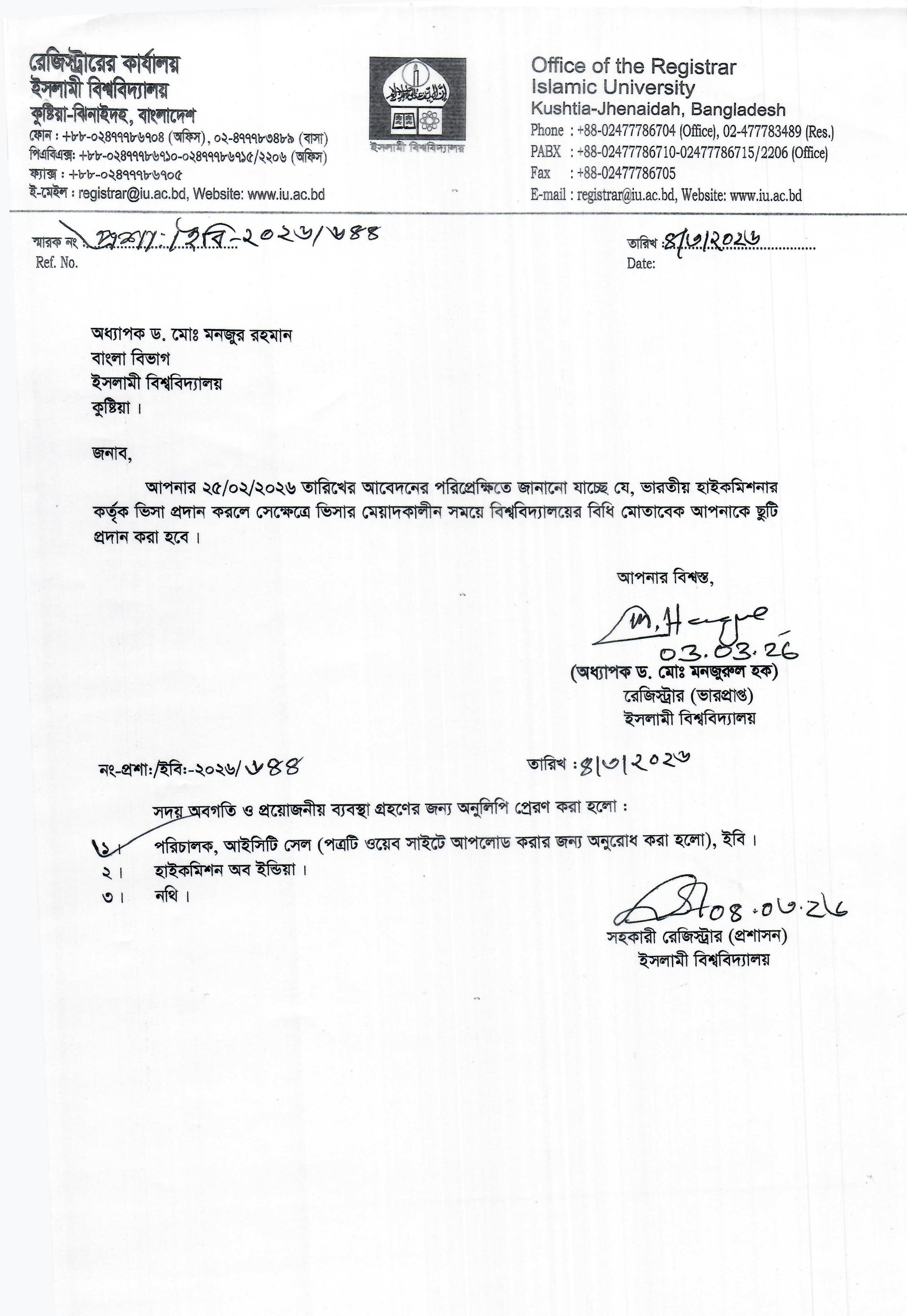 VIEWPermission to go to India for Professor Dr. Md. Abdul Rahman Anwari, Department of D’awah and Islamic Studies, Islamic University, Kushtia, Bangladesh.