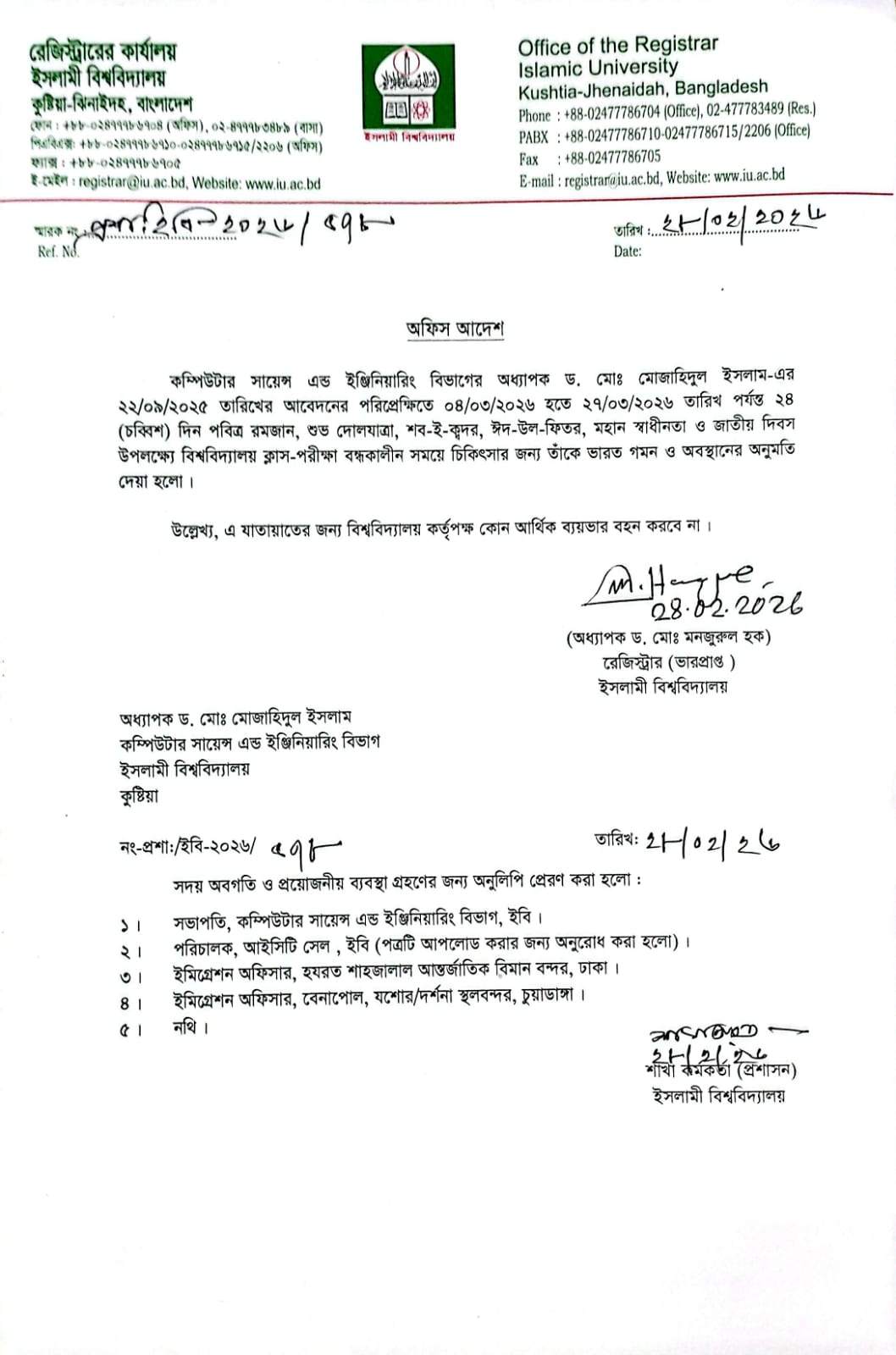 VIEWচিকিৎসার জন্য কম্পিউটার সায়েন্স এন্ড ইঞ্জিনিয়ারিং বিভাগের অধ্যাপক ড. মোঃ মোজাহিদুল ইসলাম-এর ভারত গমণ ও অবস্থানের অনুমতি প্রসঙ্গে