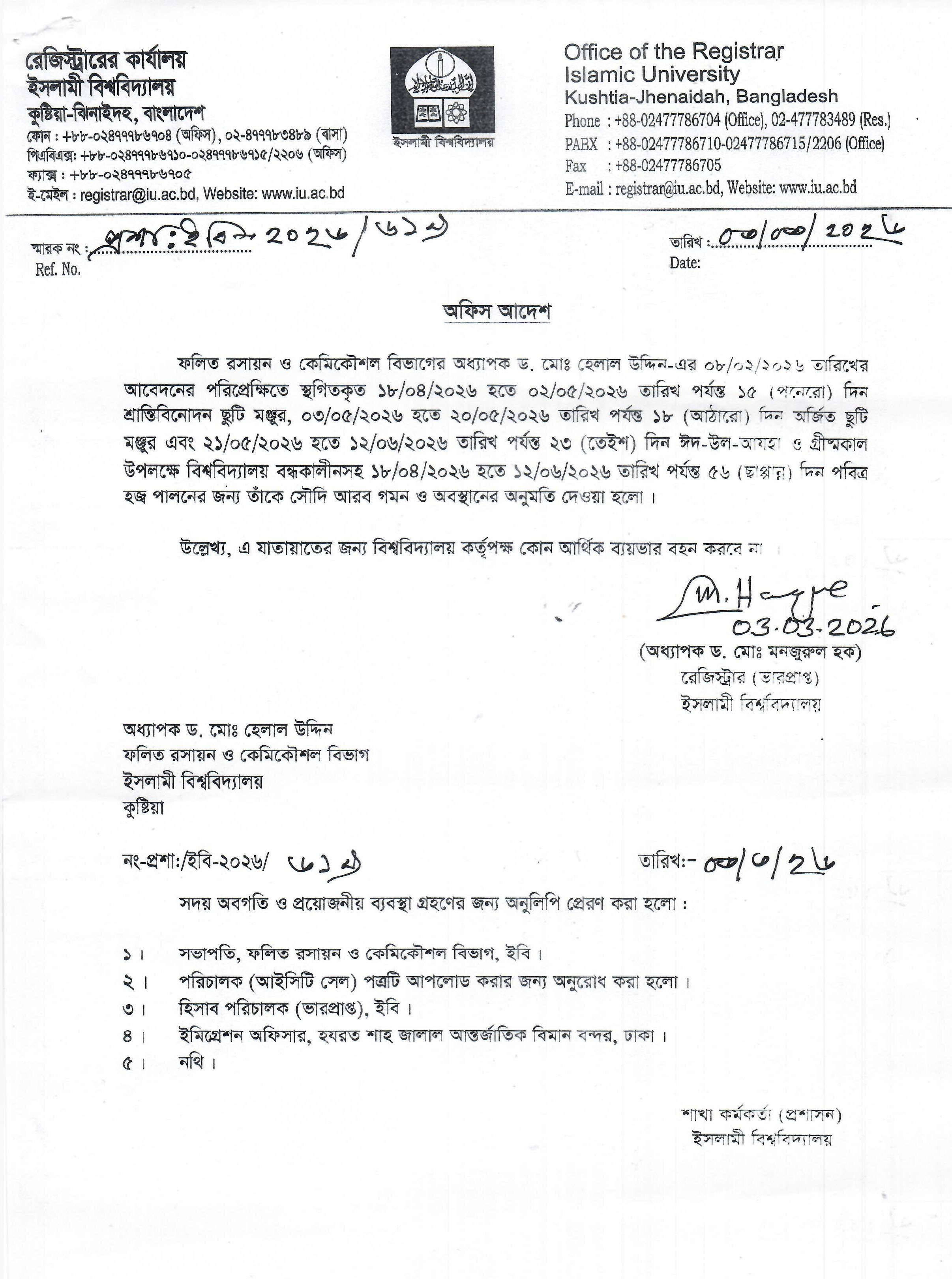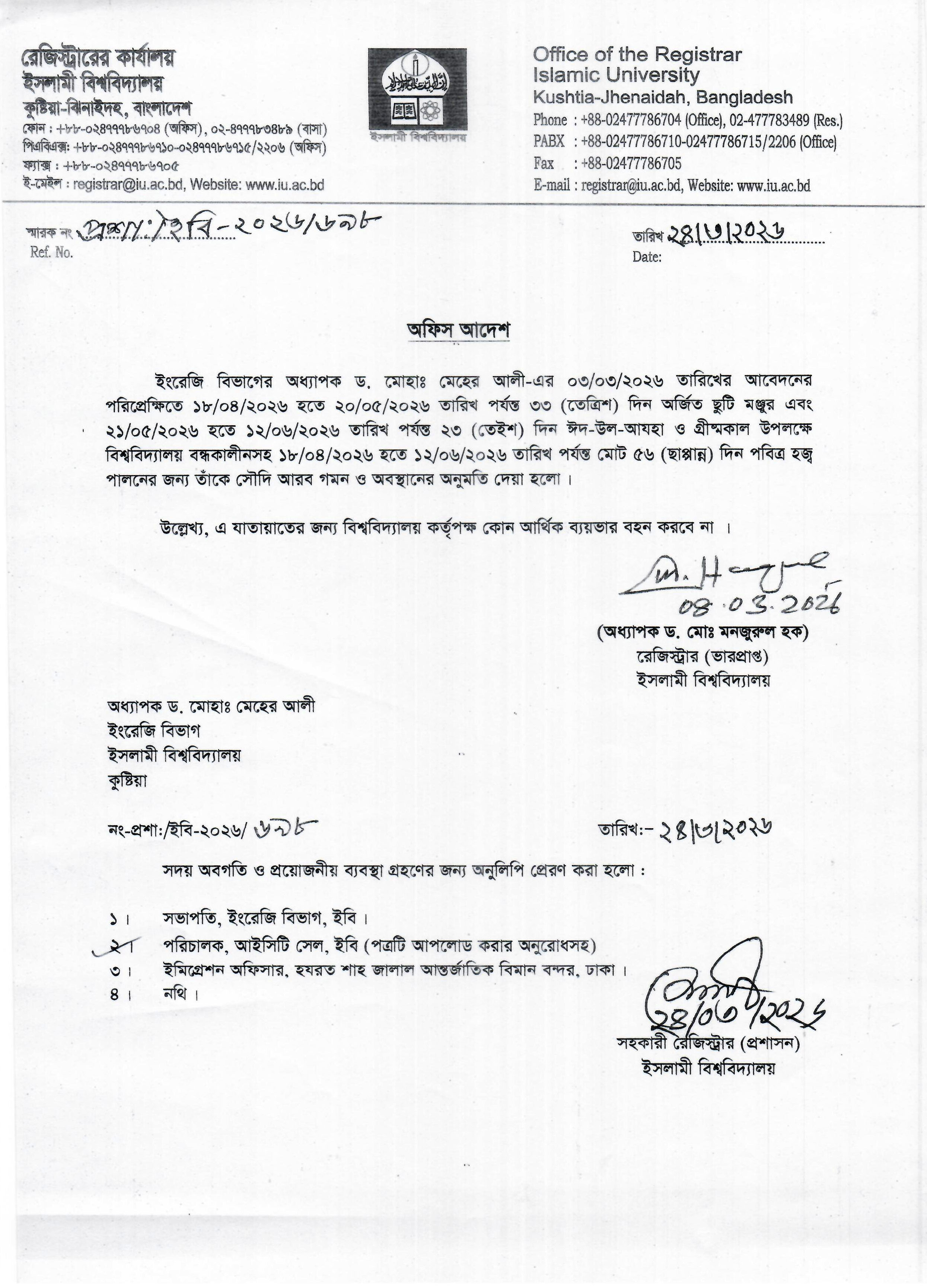 VIEWPermission to go to India and Algeria for Professor Dr. Md. Abdur Rahman Anwari, Department of D’awah and Islamic Studies, Islamic University, Kushtia, Bangladesh.
