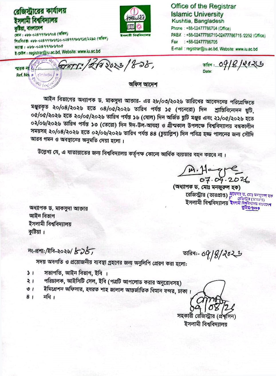পবিত্র হজ্ব পালনের জন্য অধ্যাপক ড. মাকসুদা আক্তার-এর সৌদি আরব গমণ ও অবস্থানের অনুমতি প্রসঙ্গে