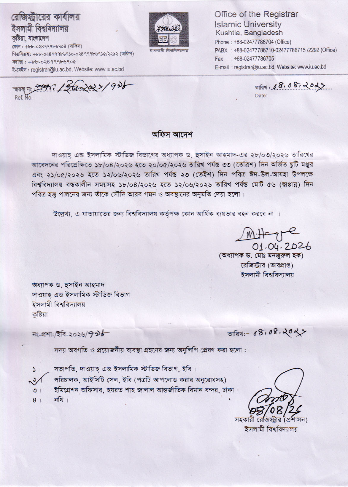 VIEWপবিত্র হজ্ব পালনের জন্য দাওয়াহ্ এন্ড ইসলামিক স্টাডিজ বিভাগের অধ্যাপক ড. হুসাইন আহমাদ - এর সৌদি আরব গমণ ও অবস্থানের অনুমতি প্রসঙ্গে