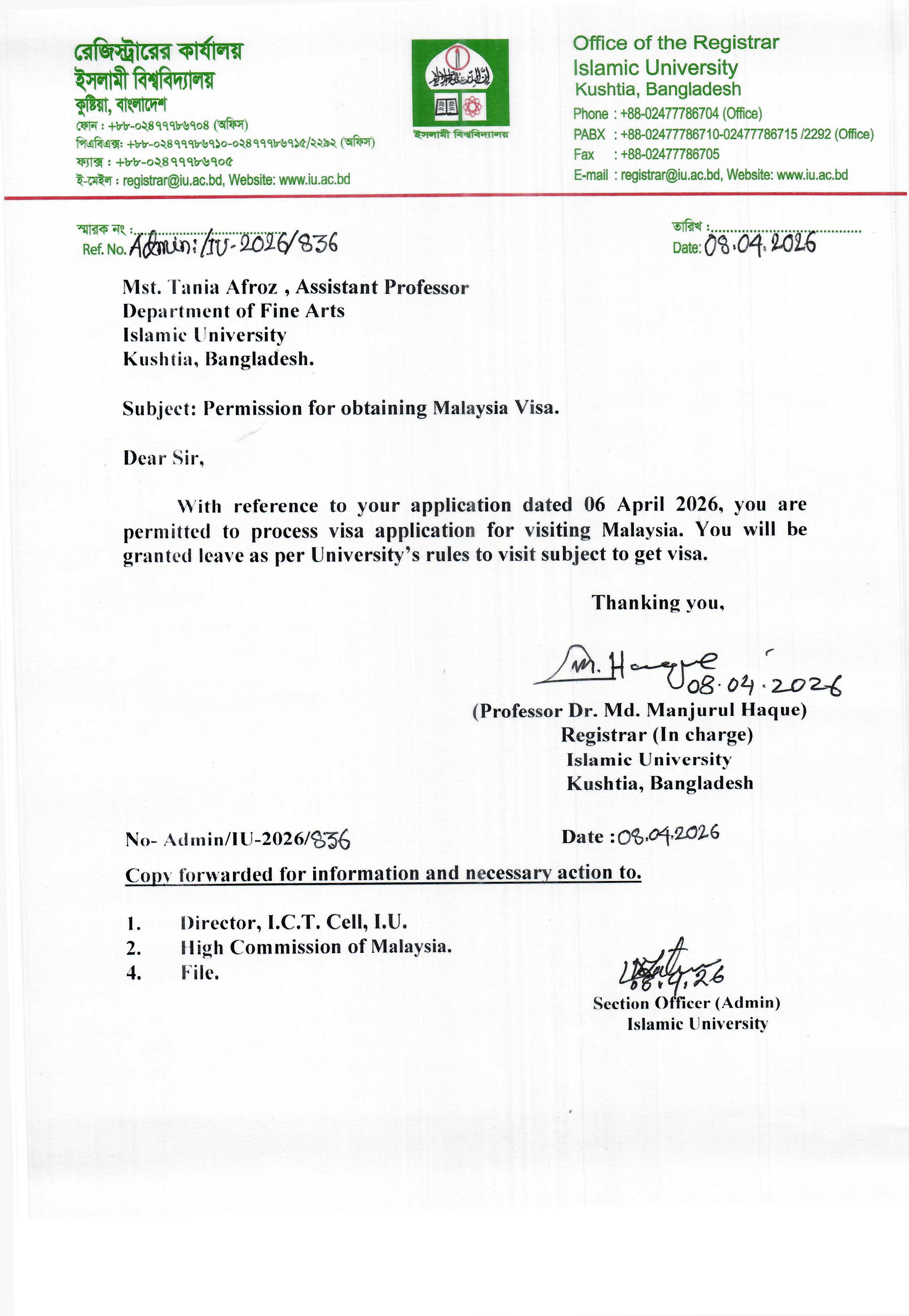 VIEWPermission for obtaining Malaysia Visa, Mst. Tania Afroz, Assistant Professor, Department of Fine Arts, Islamic University, Kushtia, Bangladesh.