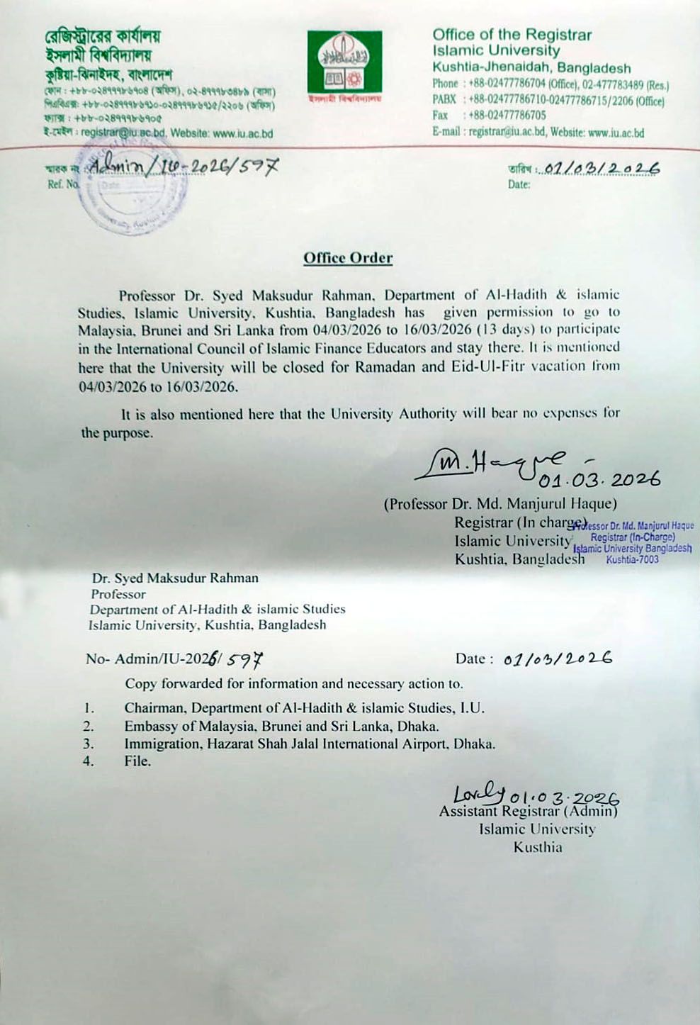VIEWPermission to go to Malaysia, Brunei and Sri Lanka for Professor Dr. Syed Maksudur Rahman, Department of Al-Hadith and Islamic Studies, Islamic University, Kushtia, Bangladesh.