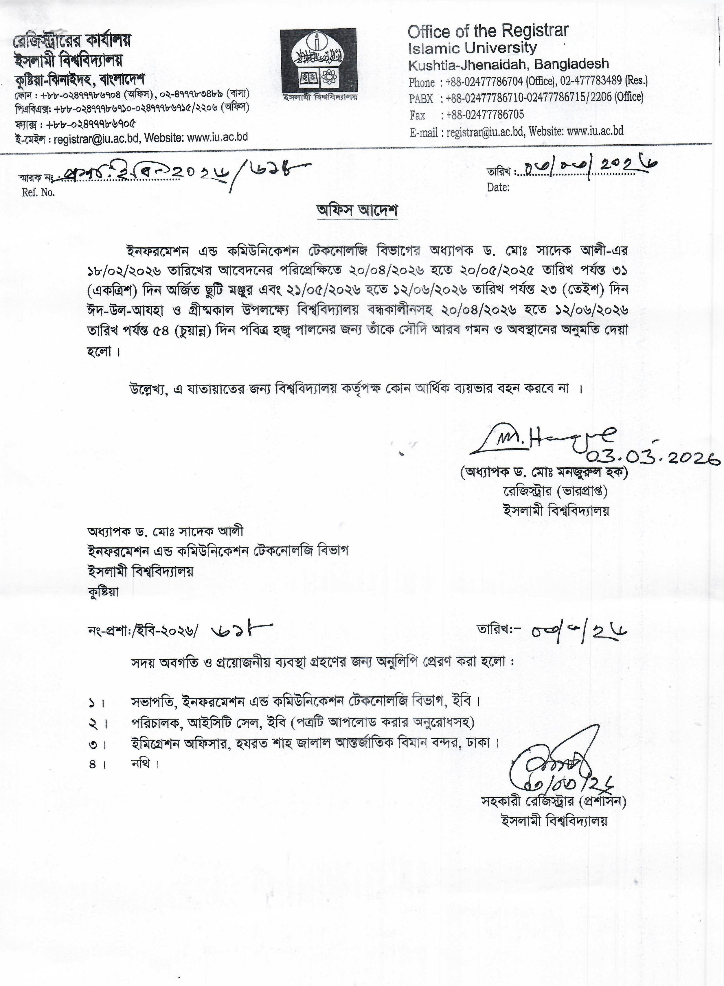 VIEWপবিত্র হজ্ব পালনের জন্য ইনফরমেশন এন্ড কমিউনিকেশন টেকনোলজি বিভাগের অধ্যাপক ড. মোঃ সাদেক আলী-এর সৌদি আরব গমন ও অবস্থানের অনুমতি প্রসঙ্গে